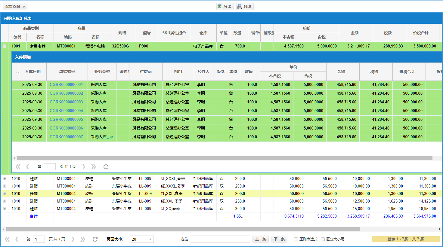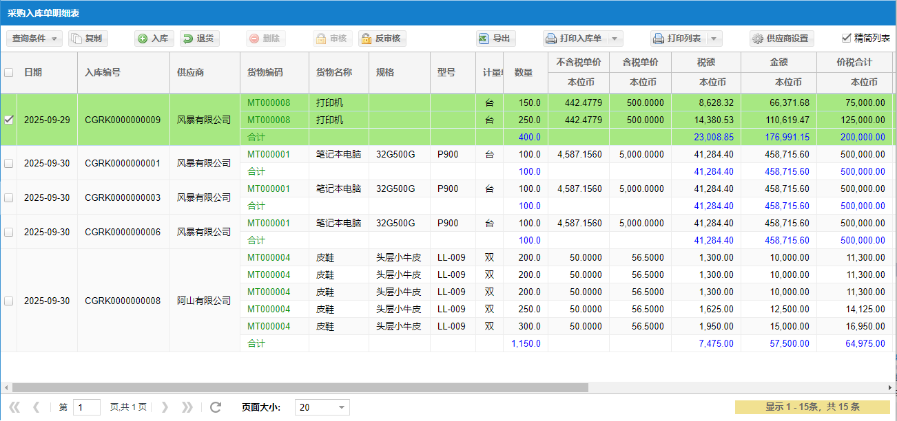 默认每条记录是汇总数据。点击左侧加号可以展开具体入库明细记录。
