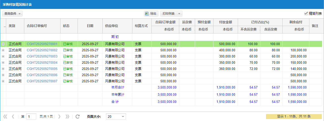 ⑥【报表】采购付款情况统计表;