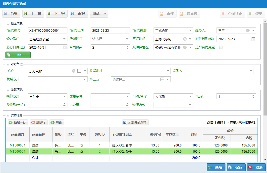①销售合同/订单录入
