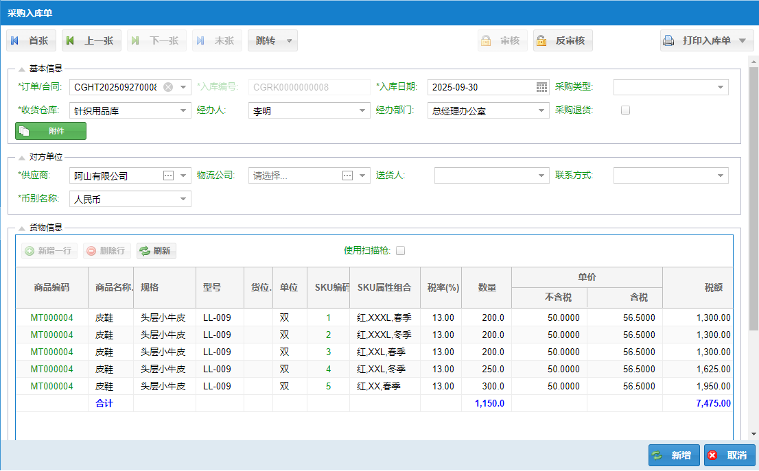 【审核/反审核】 → 确认无误后即可审核,审核后合同/订单才能被入库单引用和付款操作;