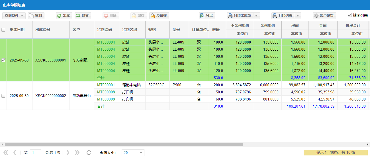 默认每条记录是汇总数据。点击左侧加号可以展开具体出库明细记录。