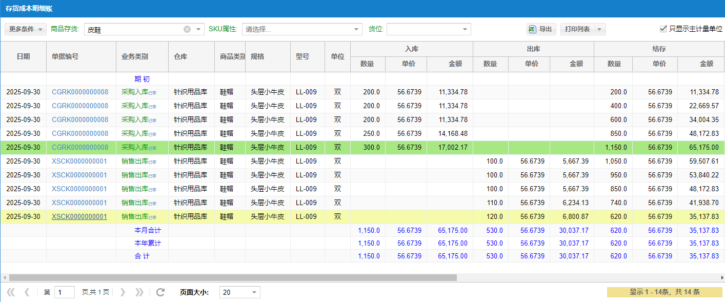 列示商品基本信息、出入库对应的单据编号(点击编号可以打开对应的单据信息)、 出入库数量、单价、金额以及对方单位。