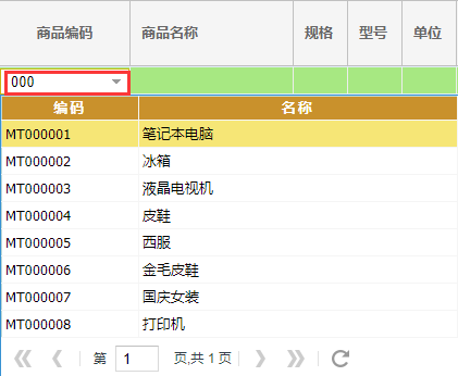 在输入商品信息时,点击商品编码单元格输入编码或者名称关键字,即可下拉商品列表以供选择,通过回车键来快速换格。